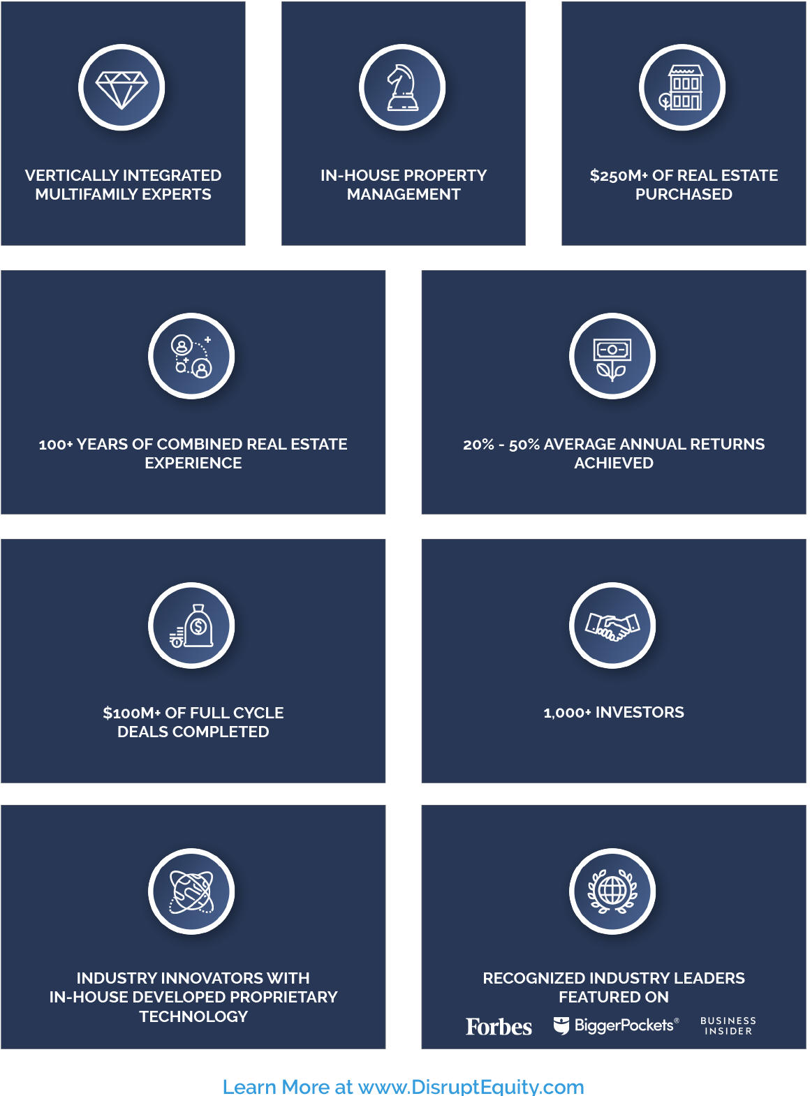 • ​Investors have trusted Disrupt Equity to deploy over $150 million in Multifamily Assets to date.
